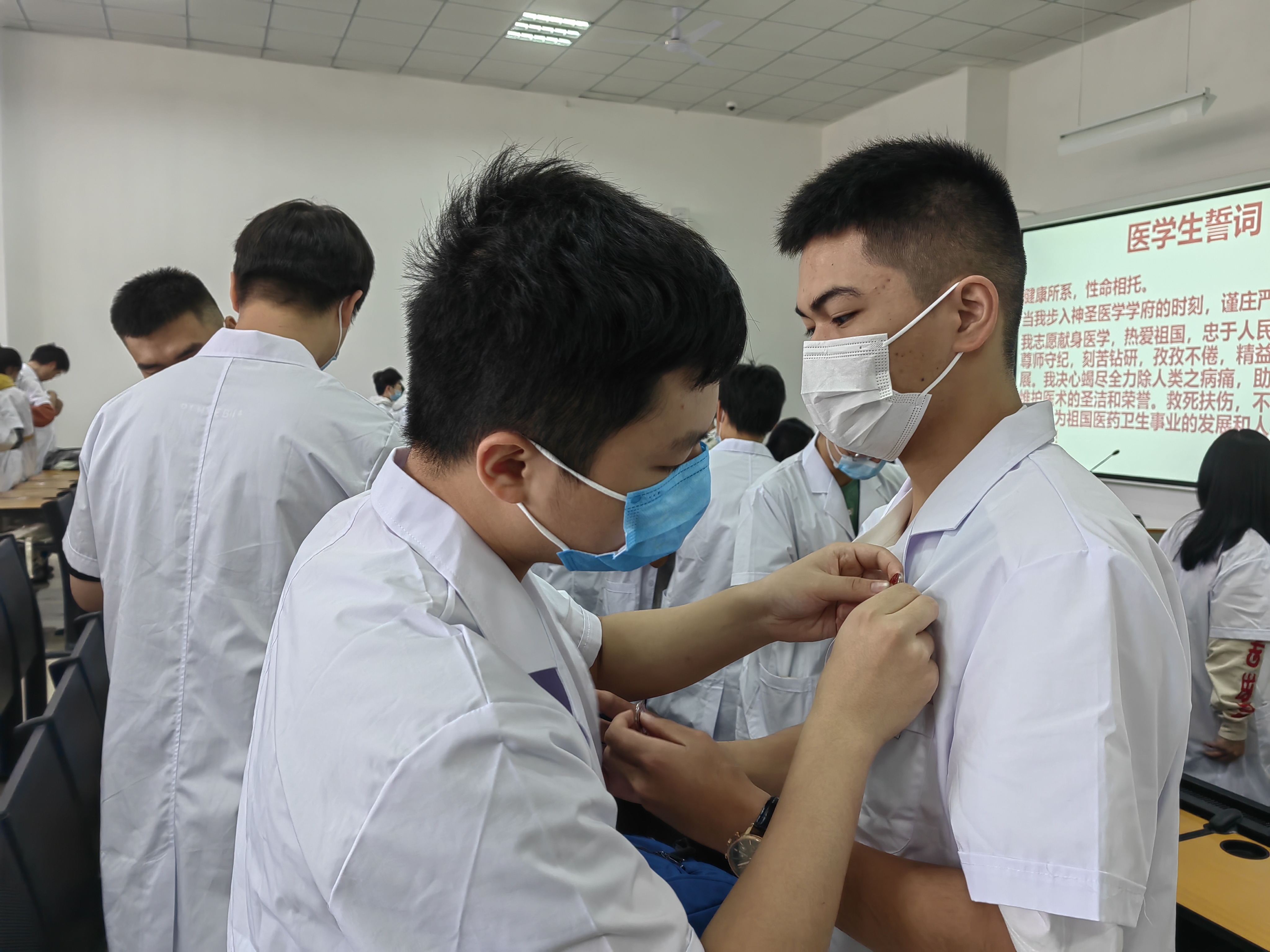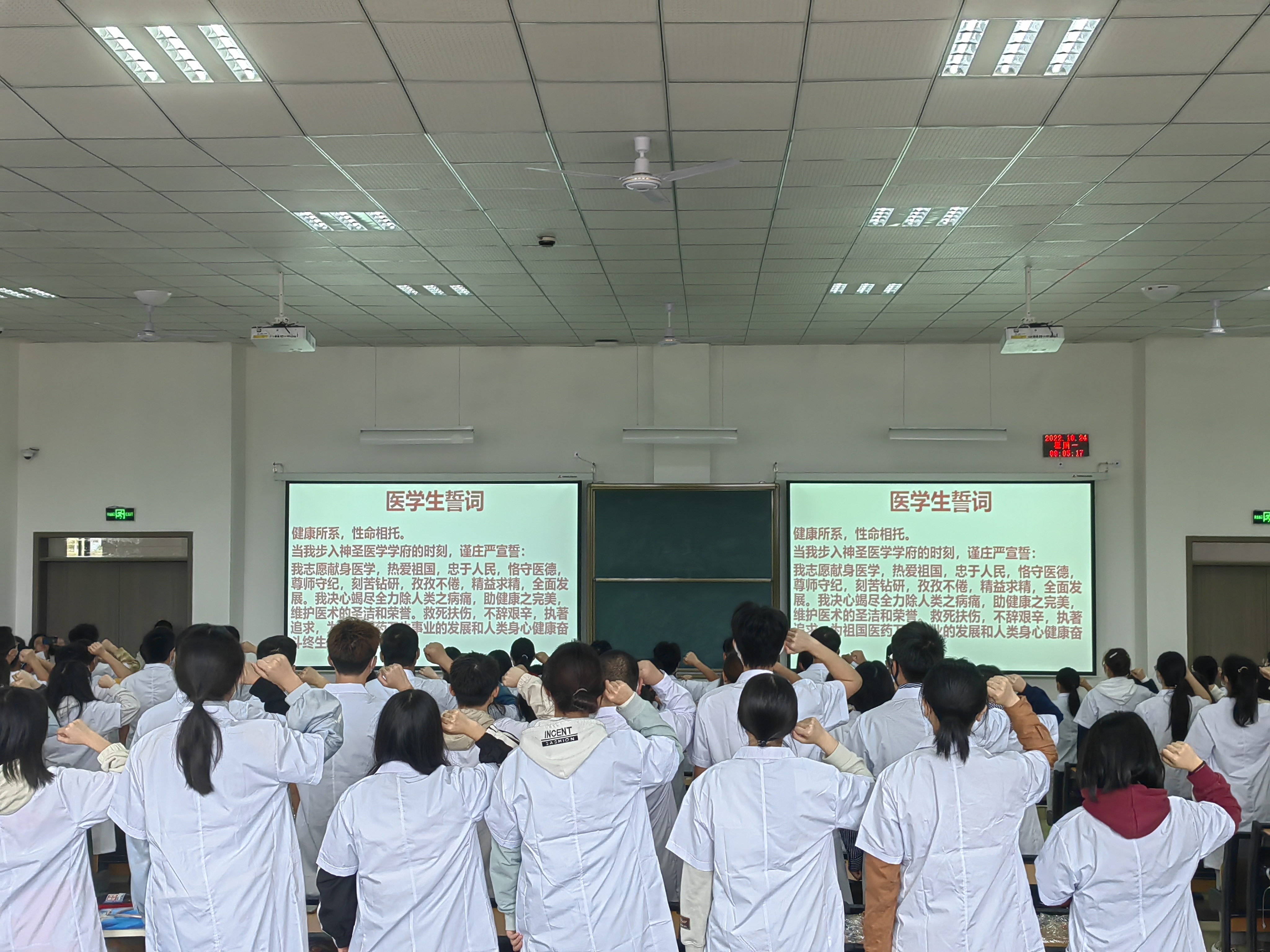 接着,举行了校徽佩戴仪式,全体新生在现场集体佩戴了校徽,熠熠闪光的校徽既是“遵医人”的象征,更是“明德笃学 求是致用”的精神载物。同时,为了巩固医员工的专业思维,感知医学的神圣,公司特意组织了充满仪式的宣誓环节,由古天乐太阳集团城经理刘兴奎教授带领全体新生进行医员工誓言宣誓,神圣的医员工誓言声声入耳,句句入心。